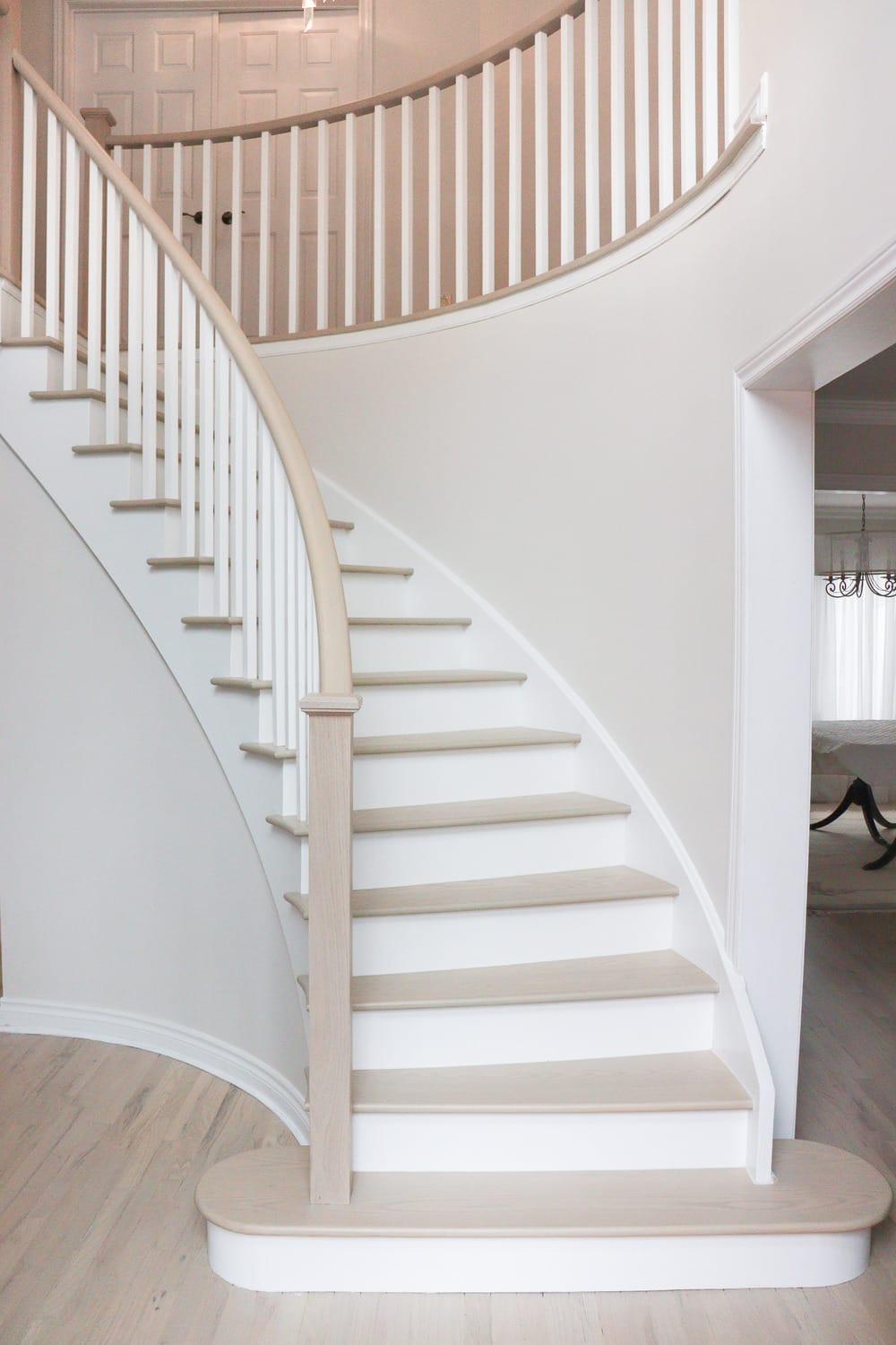 Project Ballantry showcases a modern custom kitchen and a striking spiral staircase. The spiral staircase, a focal point of the design, adds a touch of architectural sophistication, enhancing the home’s overall aesthetic. Kitchen features a refaced kitchen with brand new cabinet door but maintaining the existing cabinet boxes and countertop. We refinished and repainted the entire main floor, as well as all the stair pickets. The biggest challenge here was matching the floors and stairs to the existing prefinished floors upstairs. The kitchen features white shaker-style cabinetry, complemented by stainless steel appliances and a spacious island with a dark countertop, creating a seamless blend of functionality and elegance.