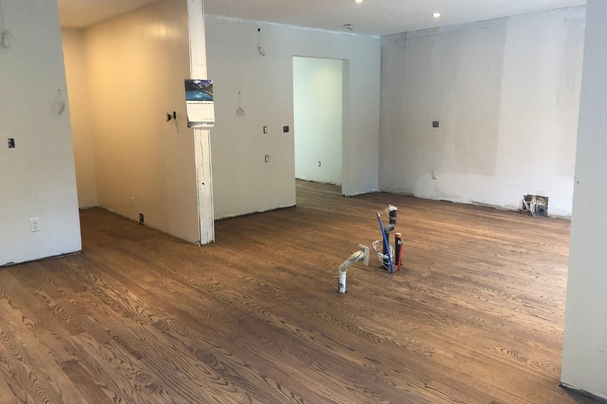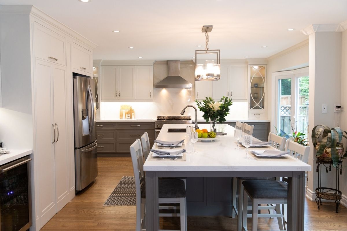 Home renovation in Brampton, Ontario. This was a complete main floor remodel. The entire layout of the main floor was modified. The existing footprint of the kitchen was doubled, and the previous dining room moved in to the previous living room. This kitchen features a hidden walk-in pantry complete with an additional freezer and lots of storage. The oversized island features storage on both sides as well as a seating for 7. This new layout enabled the client to upgrade to a larger stove and hood vent, which is adorned with beautiful curved mullion doors with glass. The project blends contemporary aesthetics with functional design. The renovation features sleek grey cabinetry, a spacious island with seating for dining, and elegant pendant lighting, creating a welcoming and efficient space for both cooking and entertaining. The countertop features a quartz Calcatta look With tones of gray and gold. The Countertop also flows as the backsplash to create this seamless, elegant look. A standout element is the concealed butler’s pantry, cleverly disguised as built-in cabinetry, providing ample storage while maintaining the kitchen’s streamlined appearance – a must see!