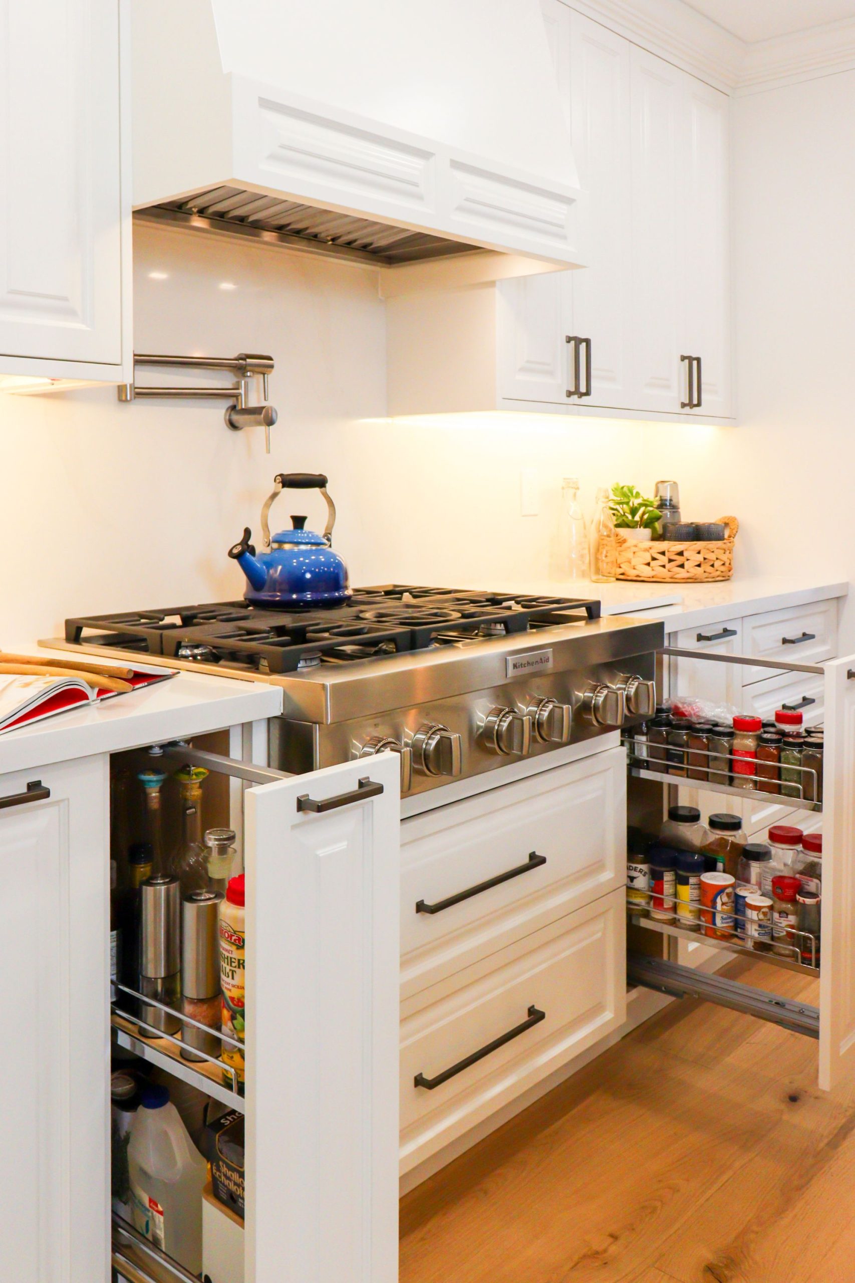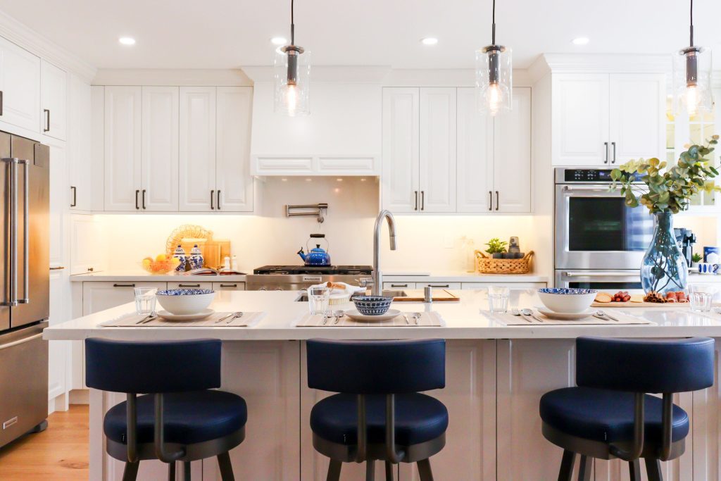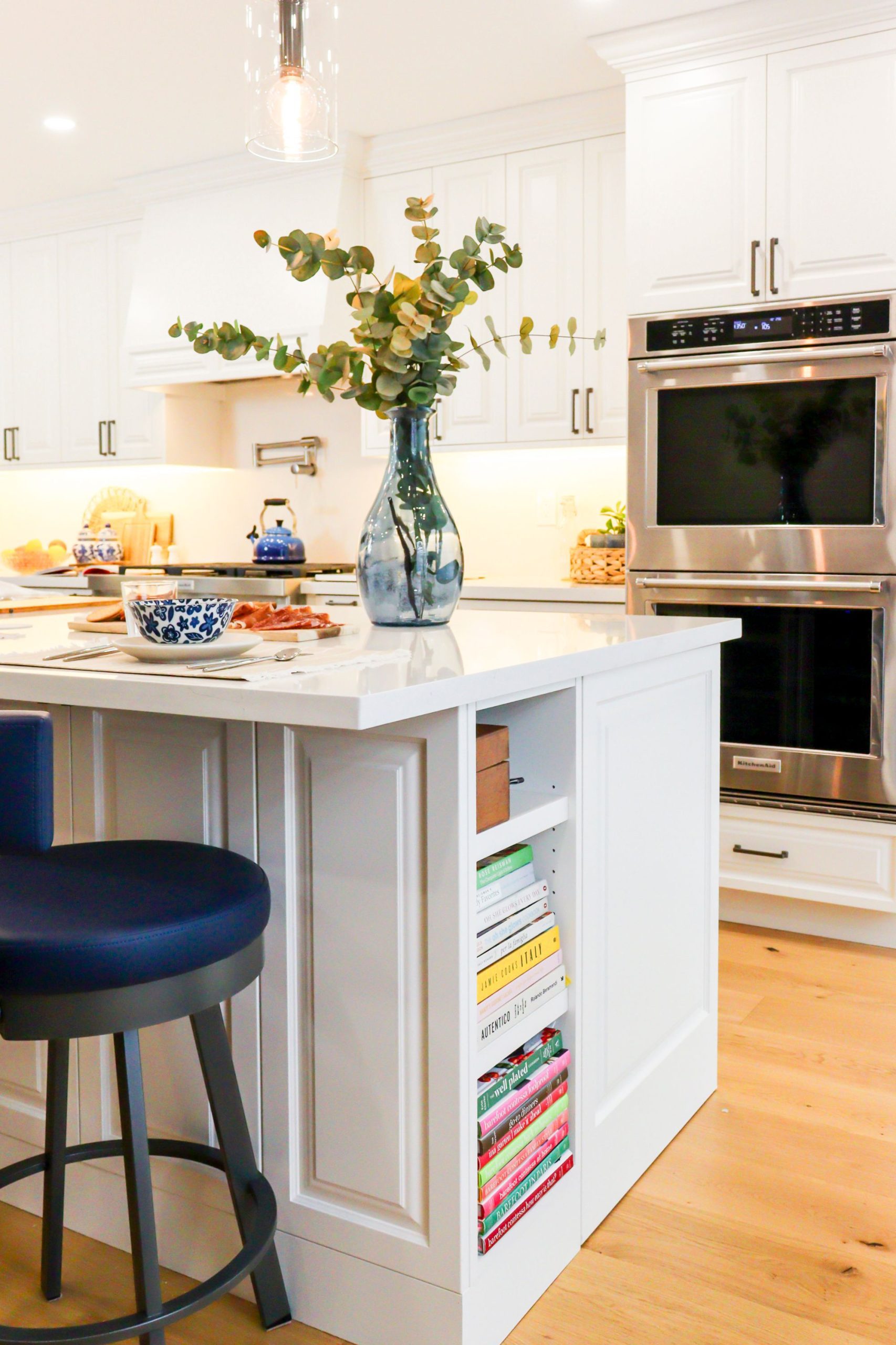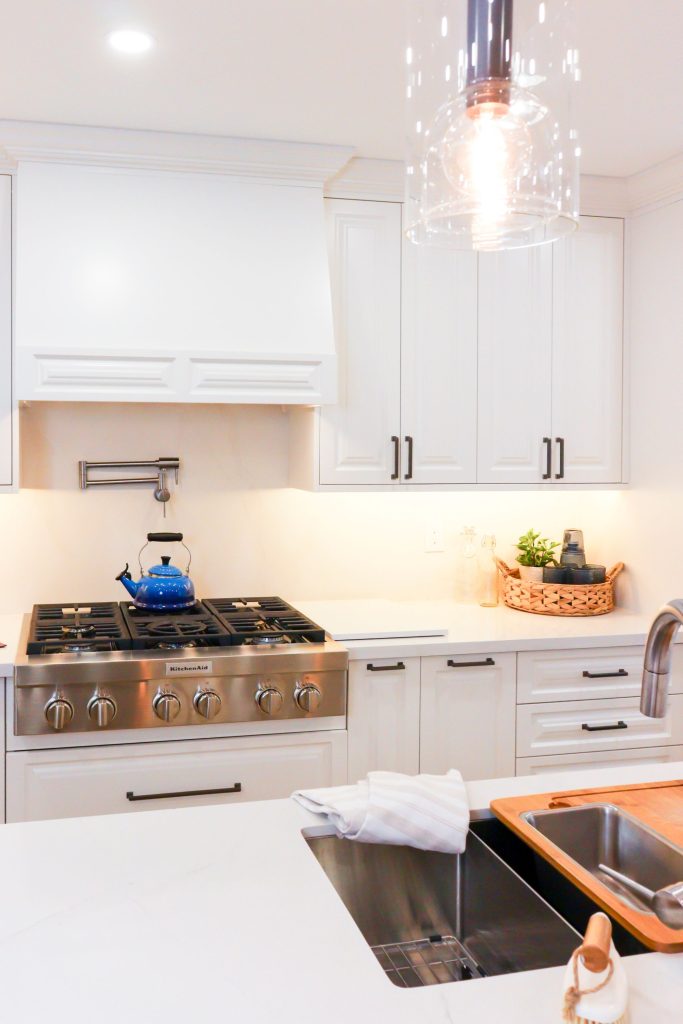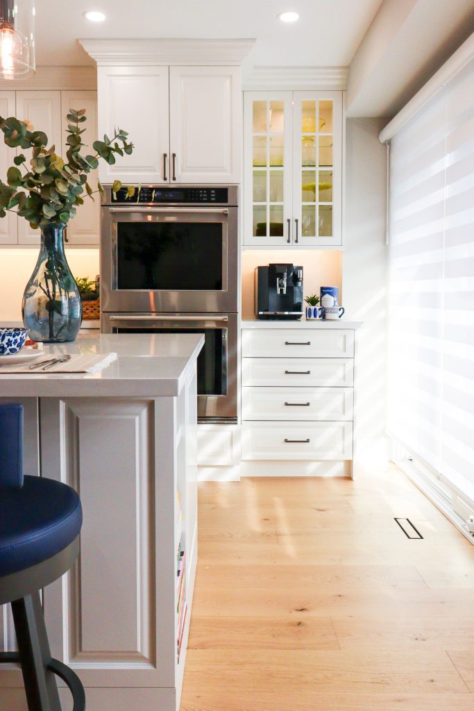 The powder room and front closet were reconfigured to allow for a better flow. On the opposite side of the staircase, the entire family room was also remodeled. Our team moved the corner fireplace to the centre of the room. Updated all the colours of the space with brighter tones for a fresh new cozy look. Project Hellensfield harmoniously blends traditional aesthetics with modern functionality. The renovation features a spacious, bright kitchen adorned with white cabinetry and a central island, offering ample workspace and storage. Adjacent to the kitchen, a cozy living room centres around a striking stone fireplace, complemented by custom floating shelves that add both charm and practicality. Throughout the home, new flooring, while thoughtful additions like a dedicated coffee station and organized pantry space cater to the homeowners’ lifestyle. This meticulous renovation exemplifies Wynwood Renovations’ commitment to creating inviting, functional spaces that respect and enhance the home’s original character.