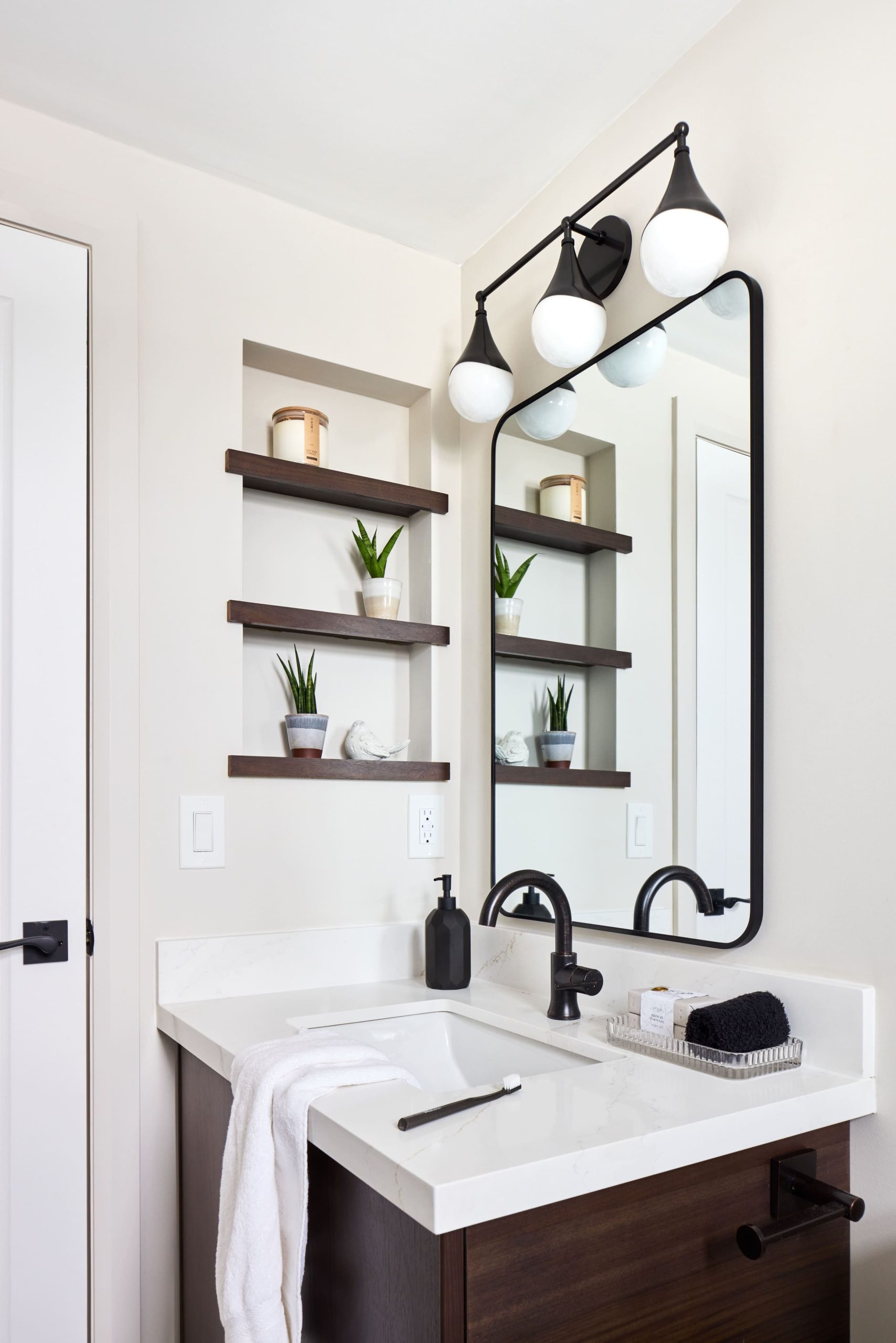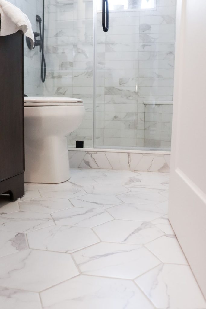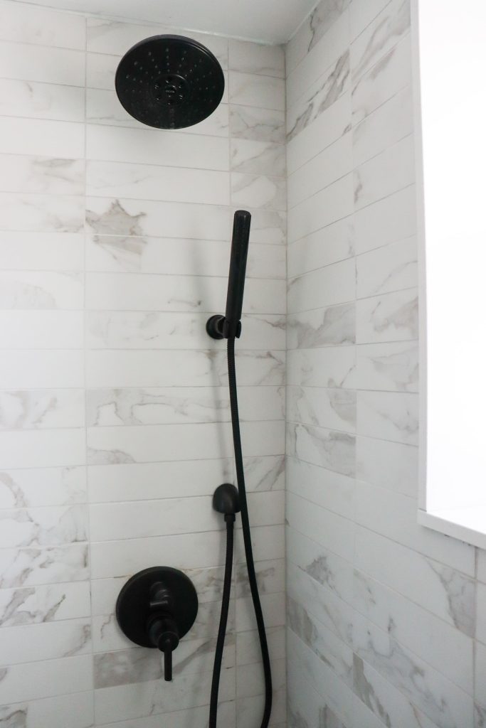 The bathroom also received a beautiful makeover. The tub was removed and a custom shower with a bench was replaced it. It features a custom walnut vanity and warm calacatta porcelain tiles. Finally all the doors, trim and hardware were all updates in the space.