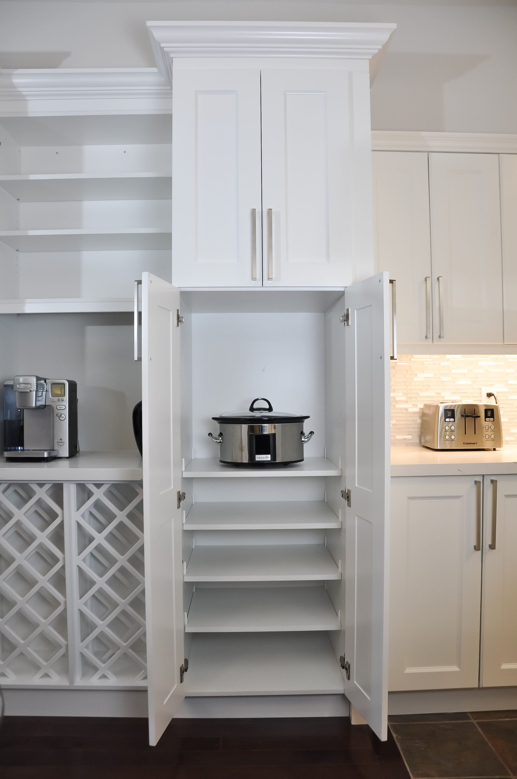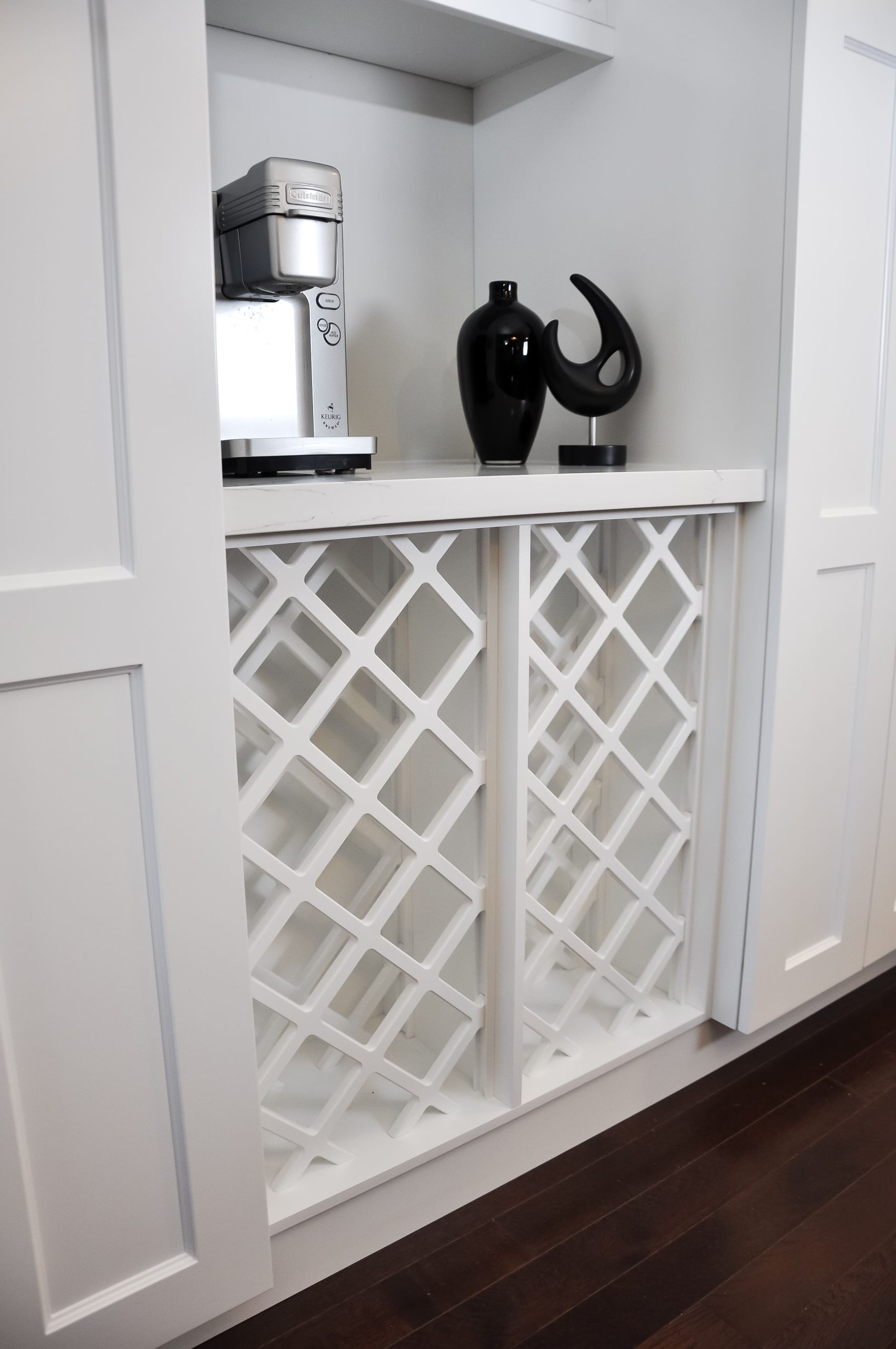 Warm neutrals, soft wood tones, and timeless texture bring calm to this modern bathroom retreat. This renovation focused on creating a fresh, grounded space with natural finishes and thoughtful detail. Custom maple cabinetry with black hardware adds warmth and definition, while the matte fixtures carry a modern edge. A chevron-patterned accent tile wraps the tub wall, introducing subtle movement and craftsmanship against smooth stone-look porcelain. The vanity design balances simplicity and function with ample storage, quartz countertops, and a clean framed mirror that reflects light throughout the room. Floating wood shelves with black accents echo the vanity tones and bring a hint of softness through greenery and simple styling.