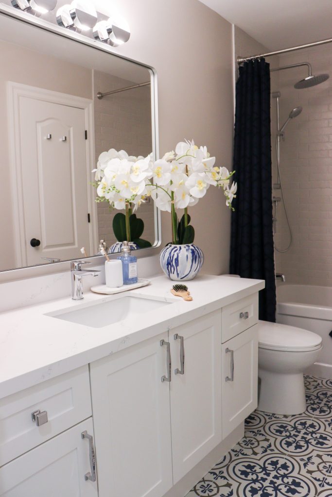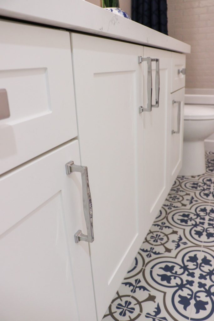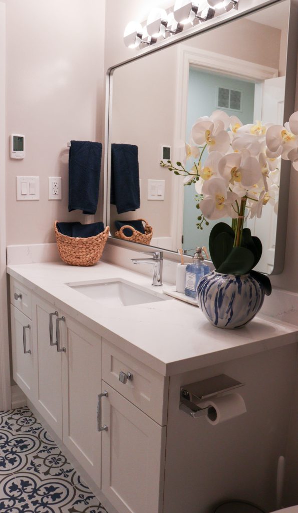 The Treeland Gallery kitchen features striking two-tone cabinetry with deep blue lower cabinets paired beautifully with crisp white uppers, creating a modern yet timeless contrast. A standout detail is the custom island panelling, adding texture and personality to the heart of the kitchen. The design maximizes function with plenty of storage throughout, including a pull-out pantry that enhances organization without sacrificing style. The project also included a new staircase and bathroom remodel.