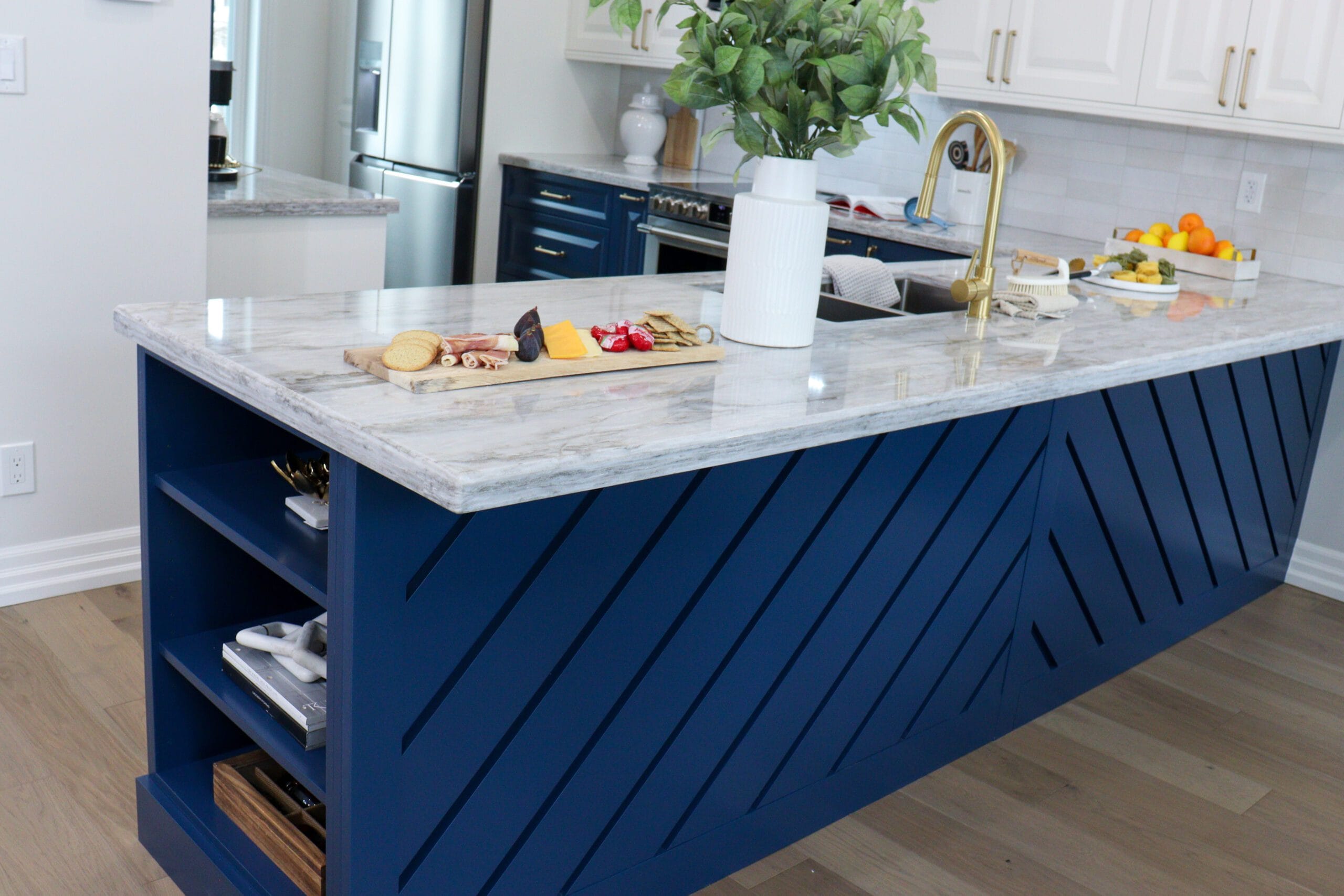 The Treeland Gallery kitchen features striking two-tone cabinetry with deep blue lower cabinets paired beautifully with crisp white uppers, creating a modern yet timeless contrast. A standout detail is the custom island panelling, adding texture and personality to the heart of the kitchen. The design maximizes function with plenty of storage throughout, including a pull-out pantry that enhances organization without sacrificing style. The project also included a new staircase and bathroom remodel.